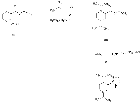 Alkylation of ethyl piperazine-2-carboxylate (I) with two equivalents of isopropyl iodide (II) afforded disubstituted piperazine (III). The title imidazoline was then obtained by reaction of the ester function of (III) with ethylenediamine (IV) in the presence of trimethylaluminum.