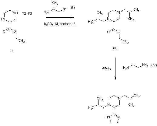 Alkylation of ethyl piperazine-2-carboxylate (I) with two equivalents of isobutyl bromide (II) under catalysis of KI afforded disubstituted piperazine (III). The title imidazoline was then obtained by reaction of the ester function of (III) with ethylenediamine (IV) in the presence of trimethylaluminum.