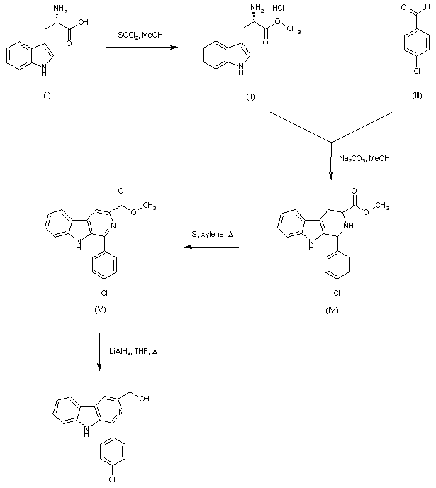 Esterification of L-tryptophan (I) by means of MeOH and SOCl2 gave the corresponding methyl ester (II). Subsequent Pictet-Spengler cyclization of (II) with 4-chlorobenzaldehyde (III) furnished the tetrahydropyridoindole (IV), which was dehydrogenated to the beta-carboline (V) using sulfur in refluxing xylene. The ester group of (V) was finally reduced to the target alcohol with LiAlH4 in THF.