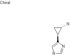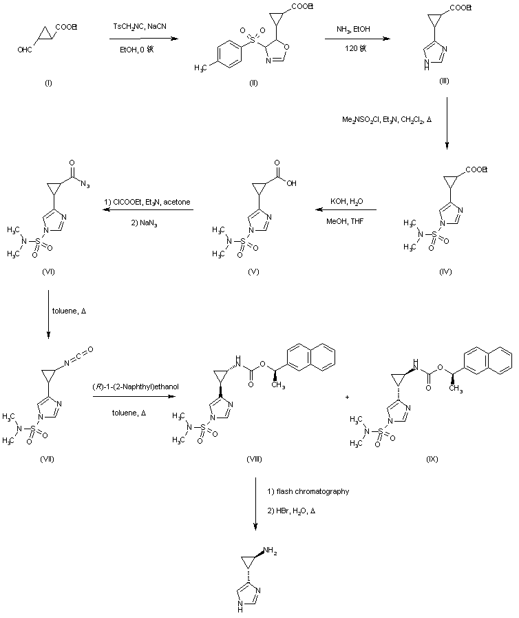 Reaction of racemic ethyl trans-2-formyl-1-cyclopropane carboxylate (I) with tosylmethyl isocyanide in the presence of NaCN produced oxazoline (II) which, upon treatment with ethanolic ammonia at 120 C in a pressurized reactor afforded imidazole (III). Subsequent protection of the imidazole nucleus with dimethylsulfamoyl chloride gave (IV). Then, basic hydrolysis of ethyl ester of (IV) provided carboxylic acid (V). After activation of (V) as the mixed anhydride with ethyl chloroformate, treatment with NaN3 produced acyl azide (VI). Curtius rearrangement of (VI) in boiling toluene gave isocyanate (VII), which was converted to a mixture of diastereomeric carbamates (VIII) and (IX) using (R)-1-(2-naphthyl)ethanol. Finally, chromatographic separation of the required isomer, followed by hydrolysis in refluxing 30% HBr furnished the target compound.