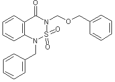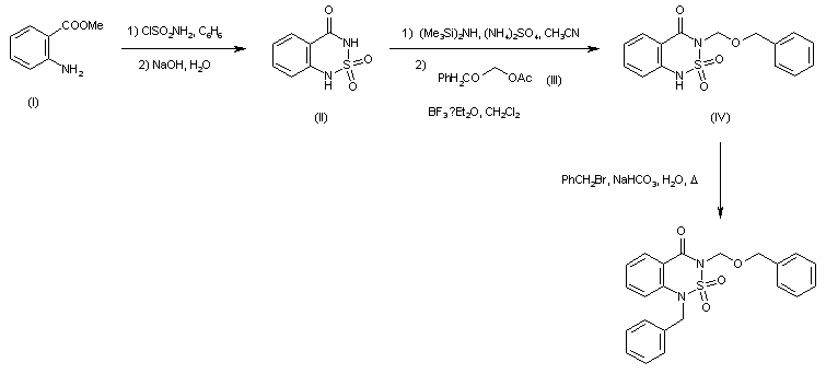 Benzothiadiazine dioxide (II) was prepared by cyclization of methyl anthranylate (I) with sulfamoyl chloride, followed by aqueous NaOH. After silylation of (II) by means of hexamethyldisilazane, alkylation with benzyloxymethyl acetate (III) in the presence of boron trifluoride etherate produced the 3-(benzyloxymethyl)benzothiazine (IV). Further alkylation of (IV) with benzyl bromide in aqueous NaHCO3 furnished the title compound.