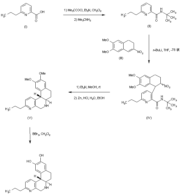 6-Propyl-2-pyridinecarboxylic acid (I) was activated as the mixed anhydride with pivaloyl chloride, and then condensed with tert-butylamine to afford amide (II). After treatment of (II) with butyllithium, the resulting dianion equilibrated to the trans isomer upon treatment with Et3N in MeOH. Reduction of (IV) with concomitant cyclization in the presence of Zn and HCl furnished the tetracyclic compound (V). Finally, cleavage of the methyl ethers of (V) using BBr3 yielded the was condensed with nitroolefin (III) to provide a cis/trans mixture of adducts (VI), which was target compound.