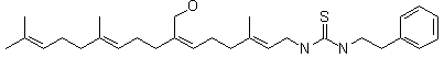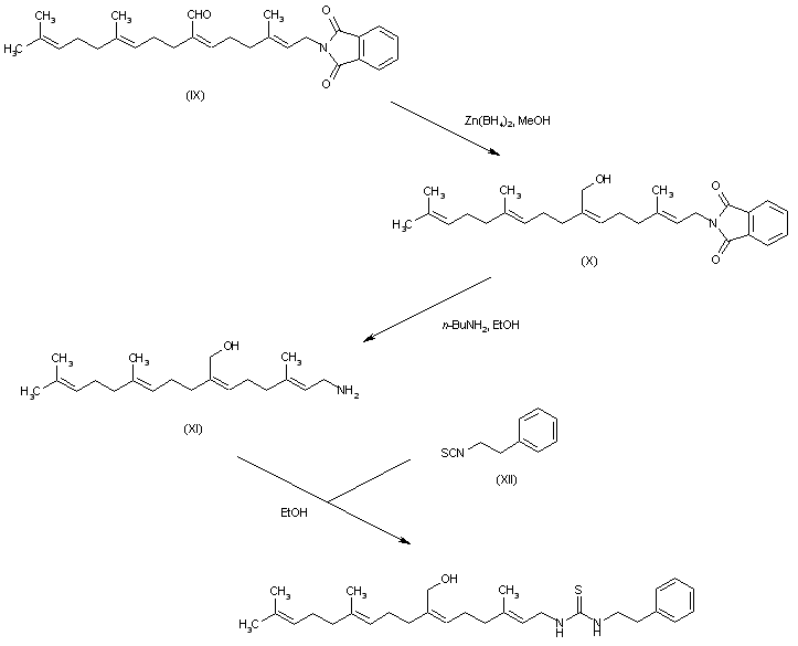 Then, selective reduction of the aldehyde by treatment with zinc borohydride produced alcohol (X). Deprotection of the phthalimide group of (X) with butylamine gave primary amine (XI). This was finally converted to the target thiourea by treatment with phenethyl isocyanate (XII) in EtOH.