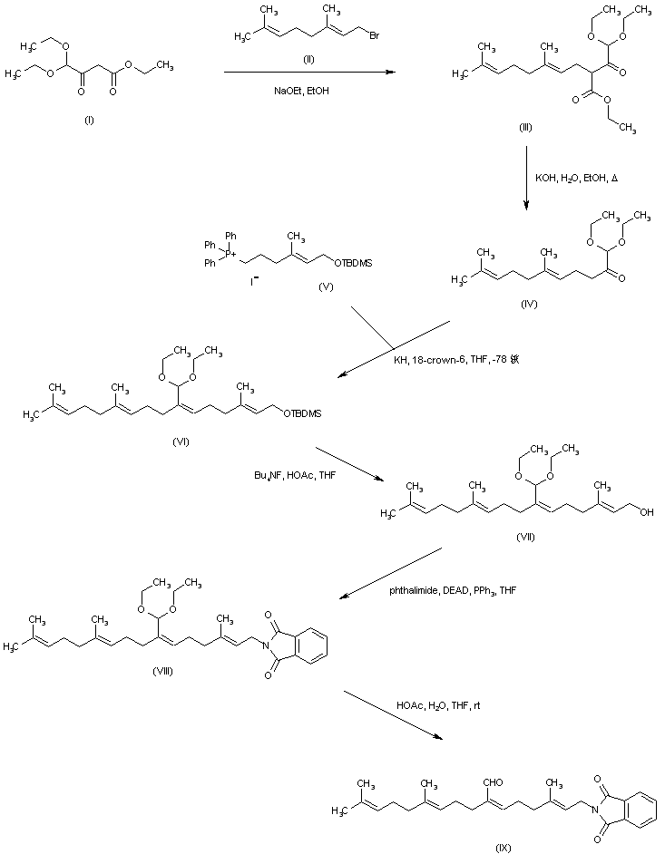 The alkylation of ethyl 4,4-diethoxyacetoacetate (I) with geranyl bromide (II) gave ketoester (III), which was further decarbethoxylated upon treatment with KOH in refluxing H2O - EtOH yielding (IV). Wittig condensation of the resulting alpha-acetal ketone (IV) with phosphonium salt (V) in the presence of KH and crown ether provided the Z olefin (VI) as the major isomer. Deprotection of the silyl ether of (VI) with tetrabutylammonium fluoride gave alcohol (VII), which was coupled with phthalimide under Mitsunobu conditions to yield (VIII). Hydrolysis of the acetal group of (VIII) with aqueous AcOH gave aldehyde (IX).