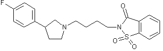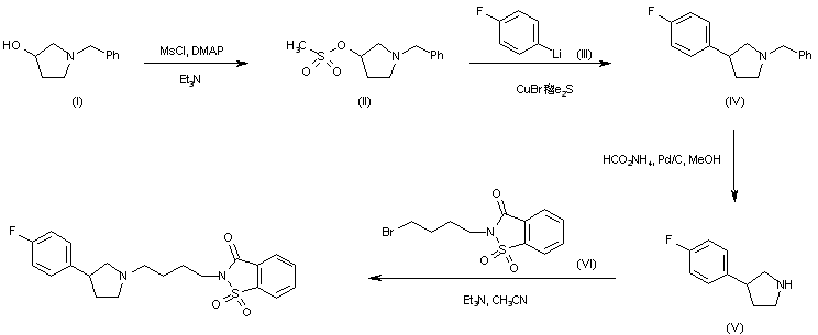 Treatment of 1-benzyl-3-hydroxypyrrolidine (I) with methanesulfonyl chloride in the presence of DMAP and Et3N affords mesylate (II). Subsequent displacement of the mesylate group of (II) with the diarylcuprate reagent generated from 4-fluorophenyllithium (III) and cuprous bromide gives the 3-aryl pyrrolidine (IV). The N-benzyl group of (IV) is then removed by transfer hydrogenolysis with ammonium formate and Pd/C, yielding the secondary amine (V). This is finally alkylated with 2-(4-bromobutyl)-3-oxo-1,2-benzisothiazole 1,1-dioxide (VI) in the presence of Et3N in refluxing acetonitrile.