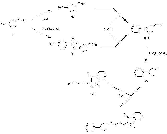 The sulfonylation of 1-benzylpyrrolidin-3-ol by means of mesyl or tosyl chlorides gives the corresponding sulfonates (II) or (III), which are condensed with the diphenyl cuprate lithium yielding 1-benzyl-3-phenylpyrrolidine (IV). The debenzylation of (IV) with ammonium formate over Pd/C in methanol affords 3-phenylpyrrolidine (V), which is finally condensed with 2-(4-bromobutyl)-1,2-benzoisothiazol-3-one S,S-dioxide (VI) by means of triethylamine in acetonitrile.