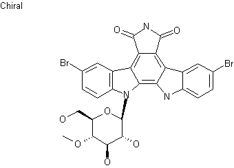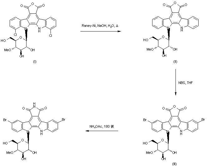 The dechlorinated rebeccamycin anhydride (II) was prepared from rebeccamycin (I) by hydrogenolysis using Raney Nickel in aqueous sodium hydroxide. Further bromination of (II) with N-bromosuccinimide afforded dibromo derivative (III). Imide (IV) was then prepared by treatment of anhydride (III) with ammonium acetate at 180 C.