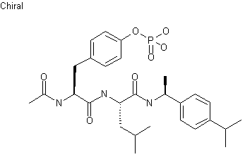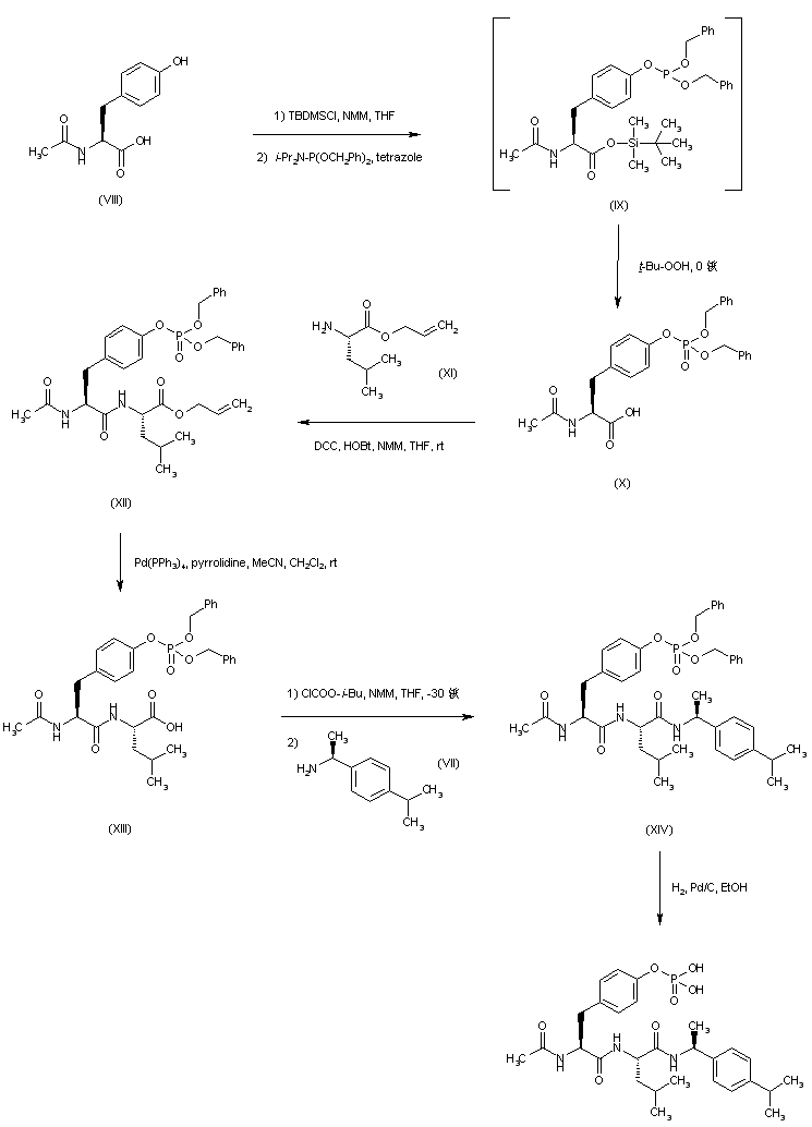 Reaction of N-acetyl-L-tyrosine (VIII) with tert-butyldimethylsilyl chloride and N-methylmorpholine (NMM), followed by phosphitylation with dibenzyldiisopropylamine phosphoramidite produced the intermediate phosphite ester (IX), which was oxidized to phosphate (X) using tert-butyl hydroperoxide. Subsequent coupling of (X) with protected leucine (XI) in the presence of DCC and HOBt afforded dipeptide (XII). Deprotection of the allyl ester of (XII) by means of Pd(PPh3)4 and pyrrolidine provided acid (XIII). After conversion of (XIII) to the corresponding mixed anhydride with isobutyl chloroformate, condensation with the chiral amine (VII) yielded amide (XIV). Finally, the benzyl ester groups of (XIV) were eliminated by catalytic hydrogenation over Pd/C.
