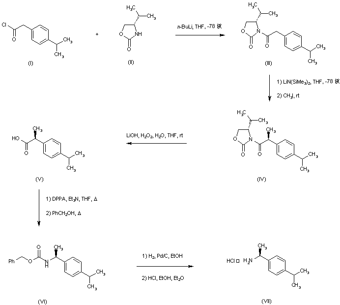 The intermediate (S)-1-(4-isopropylphenyl)ethylamine (VII) was prepared as shown in Scheme 1. Condensation of (4-isopropylphenyl)acetyl chloride (I) with the lithium salt of (S)-4-isopropyl-2-oxazolidinone (II) produced the chiral N-acyl oxazolidinone (III). Diastereoselective alkylation of (III) with MeI in the presence of lithium hexamethyldisilazide provided (IV). Removal of the chiral auxiliary of (IV) was accomplished by treatment with lithium hydroperoxide to afford the (S)-arylpropionic acid (V). Subsequent Curtius rearrangement of (V) using diphenyl phosphoryl azide, followed by treatment of the intermediate isocyanate with benzyl alcohol, furnished the benzyl carbamate (VI). Then, catalytic hydrogenation of (VI) over Pd/C yielded the target amine (VII).