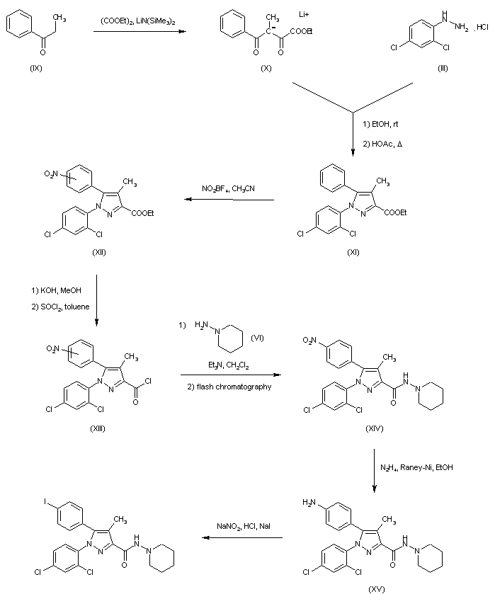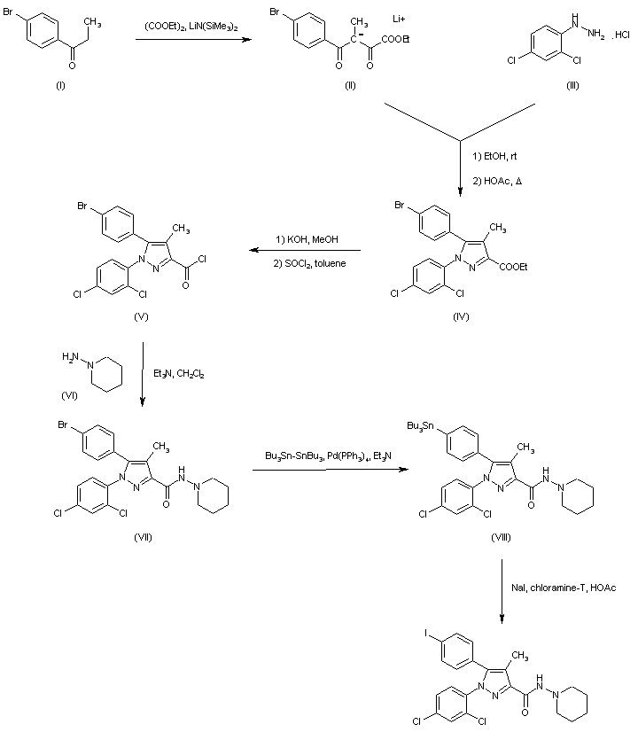 Claisen condensation of 4'-bromopropiophenone (I) with diethyl oxalate using lithium bis(trimethylsilyl)amide provided the lithium salt of diketone (II). Subsequent condensation of (III) with 2,4-dichlorophenyl hydrazine (III), followed by cyclization of the intermediate hydrazone in refluxing AcOH yielded the desired pyrazole (IV). After hydrolysis of the ester group of (IV), the resulting carboxylic acid was converted to acid chloride (V) by treatment with SOCl2. Coupling of (V) with 1-aminopiperidine (VI) gave amide (VII). Conversion of (VII) to the tributyl-stannyl derivative (VIII) was achieved by reaction with hexabutylditin in the presence of catalytic tetrakis(triphenylphosphine)palladium. The desired iodo compound was then obtained by treatment of (VIII) with NaI and chloramine-T.