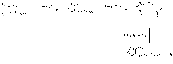 Cyclocondensation of 4-azido-3-nitrobenzoic acid (I) in boiling toluene yielded the benzoxadiazol system (II). Subsequent treatment with thionyl chloride gave acid chloride (III), which was finally condensed with n-butylamine to furnish the corresponding amide.