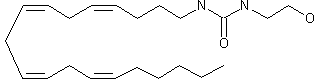 Curtius rearrangement of arachidonic acid (I) in the presence of diphenyl phosphoryl azide in hot benzene gave isocyanate (II), which was coupled with ethanolamine (III) to yield the title urea.