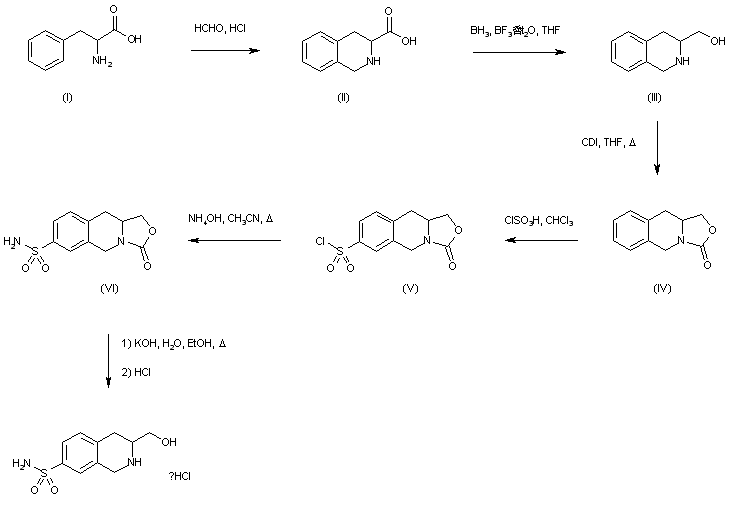 Pictet-Spengler condensation of phenylalanine (I) with formaldehyde and HCl provided tetrahydroisoquinoline (II). Reduction of the carboxylic acid (II) to alcohol (III) was then performed in the presence of borane and BF3-Et2O. Subsequent protection of amino and hydroxyl groups of (III) with carbonyl diimidazole in boiling THF produced the cyclic carbamate (IV). After chlorosulfonation of (IV), the resulting sulfonyl chloride (V) was treated with ammonia in acetonitrile to furnish sulfonamide (VI). Finally, basic hydrolysis of the oxazolidinone (VI), followed by acid decarboxylation yielded the title compound.