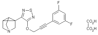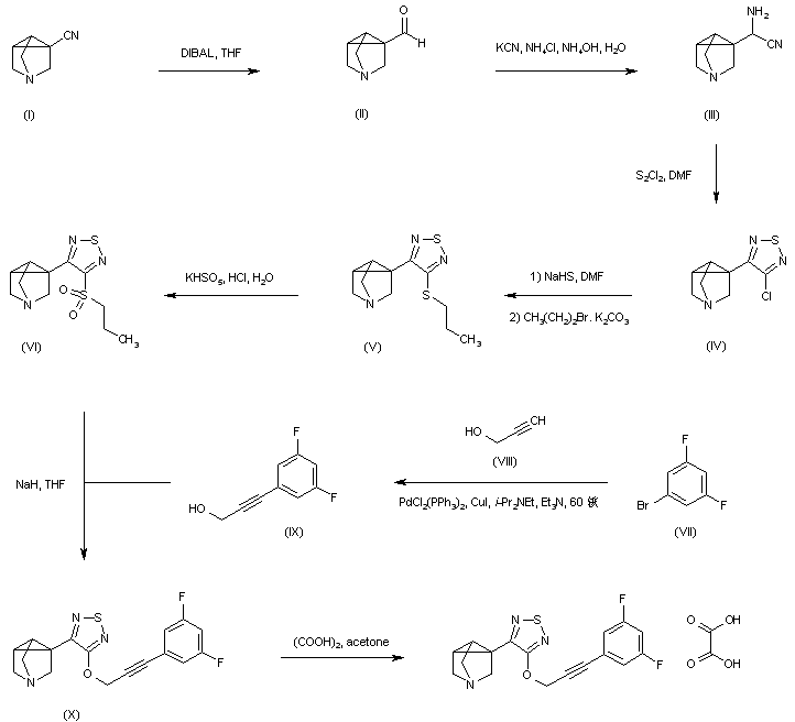 Reduction of cyanoazatricycloheptane (I) with diisobutylaluminum hydride produced aldehyde (II), which was treated with KCN and ammonia yielding aminonitrile (III). Cyclization of (III) with sulfur monochloride in DMF gave the 3-chloro-1,2,5-thiadiazole (IV). Displacement of the halogen atom of (IV) with sodium hydrogen sulfide, followed by alkylation with propyl bromide afforded the propyl thioether (V), which was oxidized to sulfone (VI) using oxone(R). The arylpropynol intermediate (IX) was prepared by coupling of 1-bromo-3,5-difluorobenzene (VII) with propargyl alcohol (VIII) in the presence of PdCl2(PPh3)2 and CuI. Reaction of sulfone (VI) with arylpropynol (IX) in the presence of NaH in THF provided the target ether (X). Finally, treatment of (X) with oxalic acid in acetone furnished the corresponding oxalate salt.