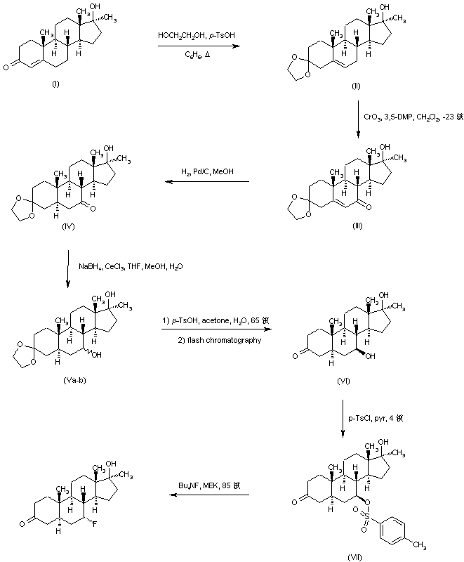Ketalization of 17alpha-methyltestosterone (I) by means of ethylene glycol and p-toluenesulfonic acid provided the DELTA5(6)-ketal (II), and subsequent allylic oxidation of (II) with CrO3-3,5-dimethylpyrazole complex gave enone (III). Hydrogenation of the olefinic double bond of (III) afforded the saturated ketone (IV), which was reduced employing NaBH4 and CeCl3 to furnish an unseparable mixture of epimeric alcohols (Va-b). After removal of the ethylene ketal of (Va-b) with p-toluenesulfonic acid/acetone, the major 7beta-alcohol (VI) was isolated by flash chromatography. The 7beta-tosylate (VII) was then prepared by reaction of (VI) with p-tosyl chloride in pyridine. Finally, exchange of the tosylate group of (VII) with tetrabutylammonium fluoride yielded the desired 7alpha-fluoride.