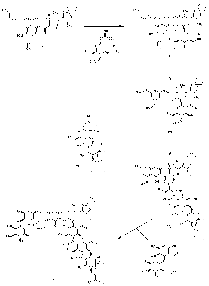 The condensation of the protected aglucone (I) with the glucoside (II) by means of TBS triflate gives the condensed alpha-glucoside (III), which is worked up to yield the bis-chloroacetylated intermediate that is desilylated to compound (IV). The condensation of (IV) with disaccharide (V) gives the trisaccharide (VI), which by deprotection of the phenolic chloroacetate and condensation with disaccharide (VII) affords the pentasaccharide (VIII).
