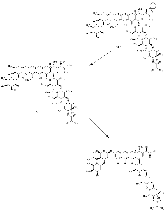 The elimination of the diol protecting group of compound (VIII) with CSA in methanol followed by silylation with TES triflate affords the silylated pentasaccharide (IX), which is finally desulfurized and deiodinated by hydrogenolysis with Et3B and Bu3SnH, and with RaNi to eliminate also the BOM protecting group, and with FH in pyridine to eliminate the silyl and chloroacetyl groups affording the target olivomycin A.