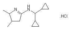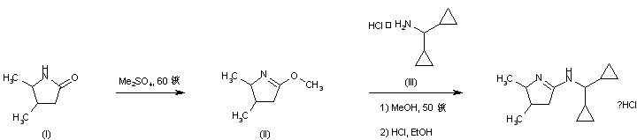 The title compound was prepared by two related procedures. Treatment of cis-4,5-dimethyl-2-pyrrolidinone (I) with dimethyl sulfate gave the methoxypyrroline (II). The methoxy group of (II) was then displaced with dicyclopropylmethylamine (III) to provide the desired aminopyrroline.