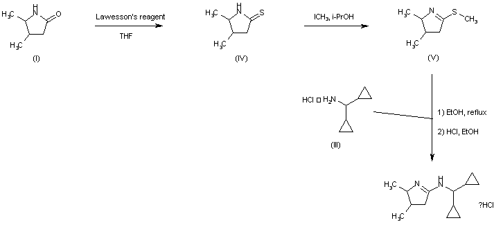 In a more convenient method, pyrrolidinone (I) was converted to the thiolactam (IV) upon treatment with Lawesson's reagent. Alkylation of (IV) with iodomethane furnished the corresponding (S)-methyl derivative (V). This was finally condensed with dicyclopropylmethylamine (III), yielding the title compound.
