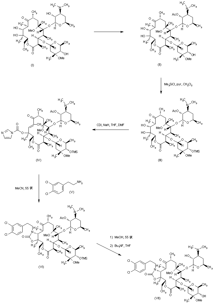 6-O-Methylerythromycin A (I) was protected as the 2'-acetate (II) and subsequently treated with chlorotrimethylsilane and pyridine to afford the 4''-O-silyl ether (III). Condensation of (III) with 1,1'-carbonyldiimidazole yielded the 12-O-acylimidazole derivative (IV), which was subsequently reacted with 3,4-dichlorophenethyl amine (V) to form the 11,12-cyclic carbamate (VI). Deprotection of the acetate ester of (VI) on heating with methanol, followed by desilylation with tetrabutylammonium fluoride in THF yielded (VII).