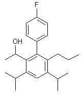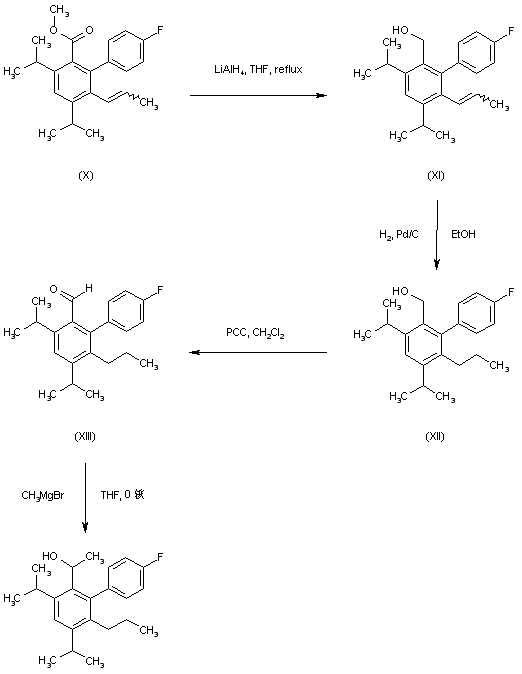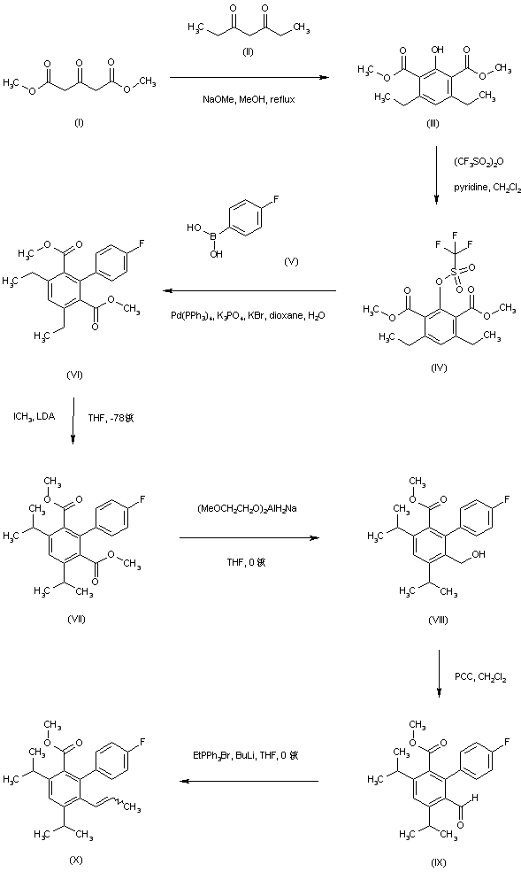 Aldol condensation between dimethyl 1,3-acetonedicarboxylate (I) and 3,5-heptanedione (II) produced dimethyl 4,6-diethyl-2-hydroxy-1,3-benzenedicarboxylate (III). After conversion of phenol (III) to the corresponding aryl triflate (IV), Suzuki coupling with 4-fluorobenzeneboronic acid (V) yielded the biphenyl derivative (VI). The diisopropyl compound (VII) was then obtained by methylation of (VI) at the benzylic position using iodomethane and LDA. Partial reduction of diester (VII) with Red-Al?gave rise to the hydroxy ester (VIII), which was further oxidized to aldehyde (IX) by treatment with pyridinium chlorochromate. Wittig reaction of aldehyde (IX) with ethyl triphenylphosphonium bromide furnished the propenyl compound (X)