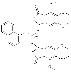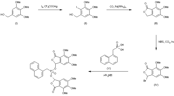 Iodination of 3,4,5-trimethoxybenzyl alcohol (I) with iodine in the presence of silver trifluoroacetate gave the 2-iodobenzyl alcohol (II). Subsequent palladium-catalyzed carbonylation-lactonization reaction with (II) gave rise to phthalide (III). This was brominated using NBS to afford the 3-bromophthalide (IV). Finally, condensation of (IV) with (1-naphthyl)methylphosphonic acid (V) yielded the title bisphthalidyl phosphonate.