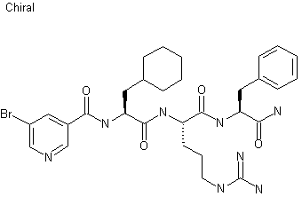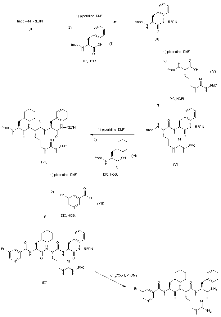 The compound was prepared via solid-phase synthesis using Rink-amide resin (I). After initial Fmoc-deprotection of (I) with piperidine in DMF, Fmoc-L-phenylalanine (II) was coupled to the resin by means of N,N'-diisopropyl carbodiimide (DIC) and hydroxybenzotriazole (HOBt) in DMF, yielding the phenylalanine-linked resin (III). Subsequent Fmoc-deprotection and coupling cycles with protected arginine (IV) and cyclohexylalanine (VI) produced the peptide resins (V) and (VII), respectively. Further deprotection of (VII) with piperidine, followed by coupling with 5-bromonicotinic acid (VIII) gave the corresponding amide (IX). Cleavage of the final peptide amide from the resin (IX) was then accomplished by treatment trifluoroacetic acid and anisole.