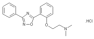 The condensation between benzamidoxime (I) and methyl salicylate (II) in the presence of NaOEt under microwave irradiation generated oxadiazole (III). Subsequent alkylation of the hydroxyl group of (III) with dimethylaminoethyl chloride and NaH in dioxan produced the target aminoethyl ether, which was finally isolated as the corresponding hydrochloride salt.