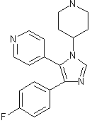 Condensation between p-fluorobenzaldehyde (I), p-toluenesulfinic acid (II) and formamide in the presence of camphorsulfonic acid afforded 4-fluorophenyltosylmethyl formamide (III). Subsequent dehydration of (III) by means of POCl3 and Et3N produced isonitrile (IV). Imine (VII) was prepared by condensation of pyridine-4-carboxaldehyde (V) with 1-Boc-4-aminopiperidine (VI) using MgSO4 as the dehydrating reagent. Dipolar cycloaddition of this imine with the anion of tosyl isonitrile (IV) generated the trisubstituted imidazole (VIII). Finally, acid cleavage of the Boc protecting group furnished the title compound.
