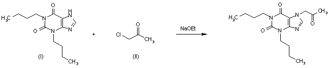 By condensation of the sodium salt of 1,3-dibutyl-xantine (I) with chloroacetone (II) in refluxing ethanol.