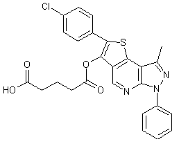 Condensation of the known chloro pyrazolopyridine (I) with the lithium salt of 4-chlorobenzylthiol (II) produces the intermediate thioether (III) which, in the presence of excess LDA, undergoes intramolecular Claisen condensation to the pyrazolothienopyridine derivative (IV). Subsequent acylation of (IV) with glutaric anhydride (V) in acetone gives rise to the target glutarate mono-ester.