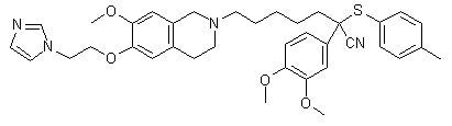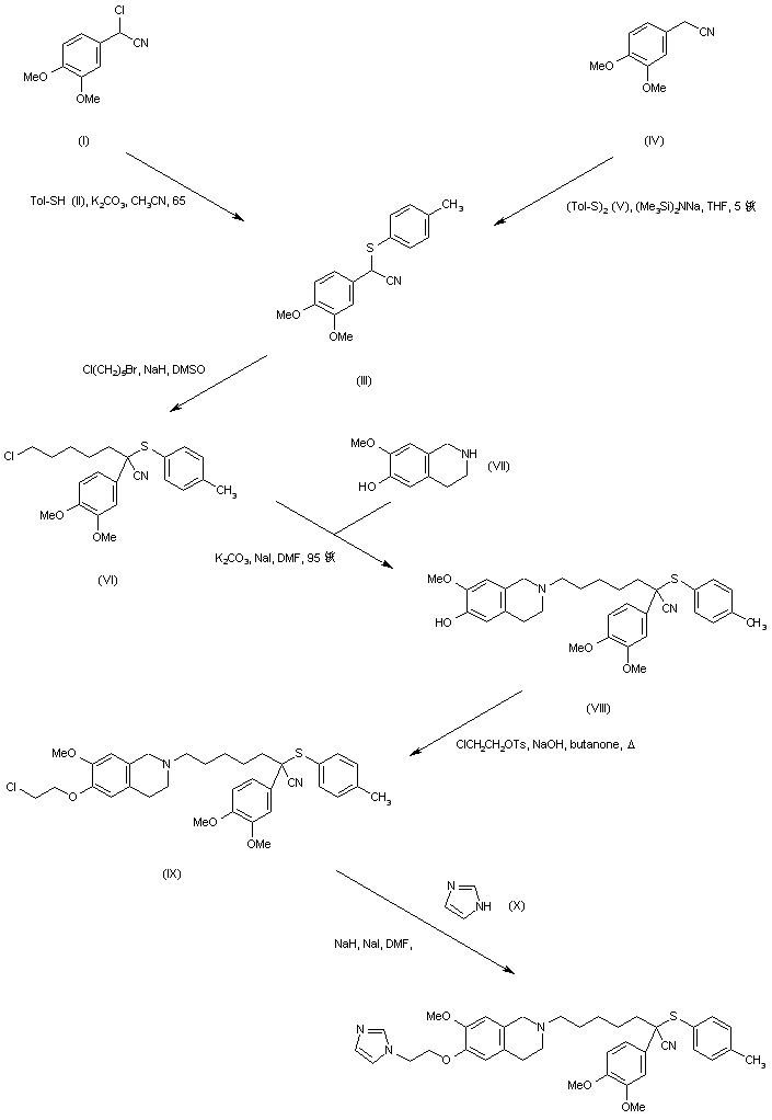 Condensation of alpha-chloro-(3,4-dimethoxyphenyl)acetonitrile (I) with p-thiocresol (II) in the presence of K2CO3 gave thioether (III). Alternatively, thioether (III) was obtained by reaction of the anion of (3,4-dimethoxyphenyl)acetonitrile (IV) with p-tolyl disulfide (V). Subsequent alkylation of (III) with 1-bromo-5-chloropentane using NaH in DMSO produced the 5-chloropentyl derivative (VI). This was then condensed with tetrahydroisoquinoline (VII) to yield the tertiary amine (VIII). Alkylation of the phenolic hydroxyl group of (VIII) with 2-chloroethyl tosylate produced the 2-chloroethyl ether (IX). Finally, reactionof (IX) with imidazole (X) and NaH in DMF furnished the title compound.