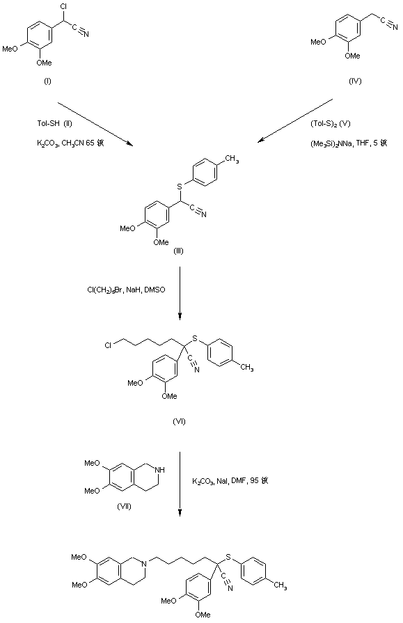 Condensation of 2-chloro-2-(3,4-dimethoxyphenyl)acetonitrile (I) with p-thiocresol (II) in the presence of K2CO3 gave thioether (III). Alternatively, thioether (III) was obtained by reaction of the anion of (3,4-dimethoxyphenyl)acetonitrile (IV) with p-tolyl disulfide (V). Subsequent alkylation of (III) with 1-bromo-5-chloropentane using NaH in DMSO produced the 5-chloropentyl derivative (VI). This was finally condensed with tetrahydroisoquinoline (VII) to yield the title compound.