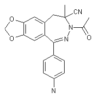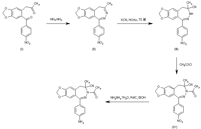 The cyclization of benzophenone (I) with hydrazine in isopropanol gives 8-methyl-5-(4-nitrophenyl)-9H-1,3-dioxolo[4,5-h][2,3]benzodiazepine (II), which is treated with KCN in AcOH at 70 C in a sealed tube to afford nitrile (III). Subsequent treatment of (III) with acetyl chloride gave the N-acetyl benzodiazepine (IV). Finally, the nitro group of (IV) was reduced to the target amine by transfer hydrogenation using hydrazine and Pd/C.
