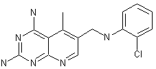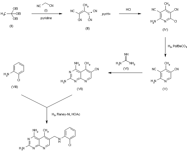 Condensation of malononitrile (I) with triethyl orthoacetate (II) in pyridine produced the intermediate (III), which was cyclized to pyridine (IV) by acidic treatment. Reductive dechlorination of (IV) by hydrogenation over Pd/BaCO3 afforded 2-aminopyridine-3,5-dicarbonitrile (V). Subsequent condensation of (V) with guanidine (VI) gave rise to the pyridopyrimidine system (VII). Finally, reductive amination of (VII) with 2-chloroaniline (VIII) by means of H2 and Raney-Ni afforded the title compound.