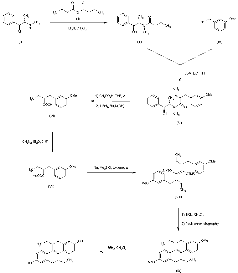 The acylation of (S,S)-pseudoephedrine (I) with butyric anhydride (II) gave the corresponding butyramide (III), which was asymmetrically alkylated with m-methoxybenzyl bromide (IV) in the presence of LDA and LiCl in THF at low temperature to produce the (S,S,R) isomer (V). Amide hydrolysis of (V) to provide the (R)-carboxylic acid (VI) was effected according to a described procedure by treatment with methanesulfonic acid in boiling THF, and then with lithium borohydride and tetrabutylammonium hydroxide. Further treatment of (VI) with ethereal diazomethane afforded the methyl ester (VII). This was submitted to acyloin condensation using Na metal and trimethylsilyl chloride to form the corresponding acyloin as the bis(silyl) ether (VIII). Double cyclization of (VIII) using TiCl4 at low temperature yielded the required tetrahydrochrysene system with minimal epimerization. The major cis isomer (IX) was then isolated by flash chromatography. Finally, deprotection of the methyl ethers of (IX) with BBr3 furnished the title bis-phenolic compound.