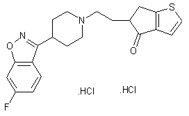 This compound has been obtained by several related ways: 1.- The Sam and Thompson cyclization of 3-(2-thienyl)acrylic acid (I) gives the thienocyclopentanone (II), which is condensed with oxoacetic acid (III) yielding 2-(4-oxo-5,6-dihydro-4H-cyclopenteno[b]furan-5-ylidene)acetic acid (IV). The reduction of (IV) with Zn and acetic acid affords the corresponding saturated compound (V), which is condensed with 4-(6-fluoro-1,2-benzisoxazol-3-yl)piperidine (VI) by means of DCC and HOBt in dichloromethane to give the corresponding piperidide (VII). The protection of the ketonic group of (VII) with ethylene glycol and TsOH yields the ethylene ketal (VIII), which is reduced at the piperidide group with LiAlH4 in ethyl ether yielding the final intermediate (IX). Finally, this compound is treated with HCl to eliminate the ethylene ketal protecting group. 2.- The condensation of the thienocyclopentanone (II) with ethyl bromoacetate (X) by means of LDA gives the acetate (XI), which is hydrolyzed with KOH in ethanol affording the previously reported saturated acetic acid derivative (V). 3.- The condensation of acetate (XI) with piperidine (VI) by means of Me3Al gives also the previously reported piperidide (VII).