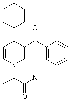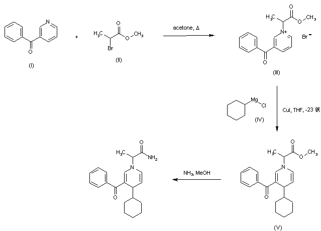 Alkylation of 3-benzoylpyridine (I) with methyl 2-bromopropionate (II) in refluxing acetone afforded pyridinium salt (III). The subsequent regiospecific copper-catalyzed condensation of (III) with cyclohexylmagesium chloride (IV) yielded dihydropyridine (V). Finally, ammonolysis of the methyl acetate ester of (V) provided the title amide.