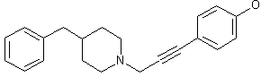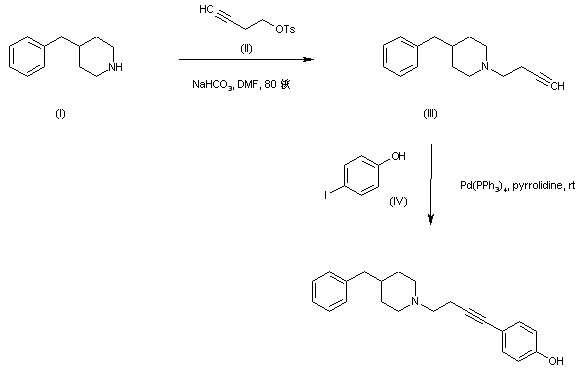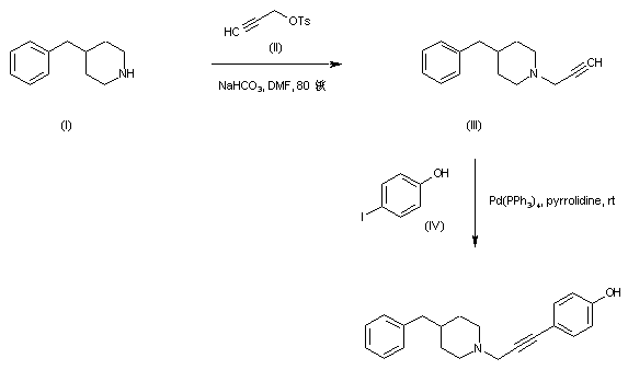 4-Benzylpiperidine (I) was alkylated with propargyl tosylate (II) to afford the N-propynyl piperidine (III). Subsequent coupling of (III) with 4-iodophenol (IV) in the presence of Pd(PPh3)4 in pyrrolidine produced the corresponding propynyl phenol.