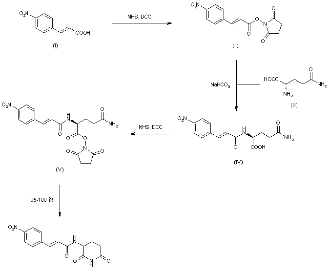 4-Nitrocinnamic acid (I) was activated as the succinimidyl ester (II) upon treatment with N-hydroxysuccinimide (NHS) and dicyclohexylcarbodiimide (DCC). Subsequent coupling of (II) with L-glutamine (III) afforded the N-acyl glutamine (IV). A second reaction of (IV) with NHS and DCC produced the active ester (V). Finally, thermal cyclization of (V), with concomitant racemization, led to the desired 2,6-piperidinedione.