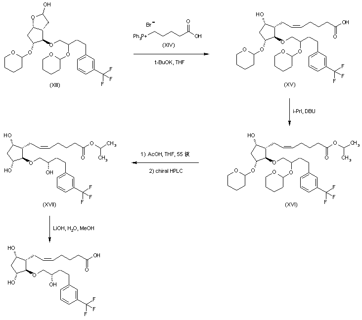 Wittig reaction of lactol (XIII) with the ylide generated from phosphonium salt (XIV) and potassium tert-butoxide afforded acid (XV), which was subsequently esterified with isopropyl iodide and DBU to give the isopropyl ester (XVI). Cleavage of the tetrahydropyranyl ethers of (XVI) under mildly acidic conditions followed by HPLC separation using a chiral column provided the desired alcohol diastereoisomer (XVII). Finally, hydrolysis of ester (XVII) under basic conditions provided the corresponding free acid.