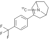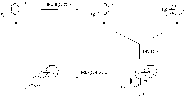 Lithiation of 4-bromobenzotrifluoride (I) by means of butyllithium provided the organolithium derivative (II), which was condensed with 8-methyl-8-azabicyclo[3.2.1]octan-3-one (III) to give the carbinol adduct (IV). Subsequent dehydration of (IV) employing HCl in AcOH produced the title olefin.