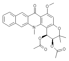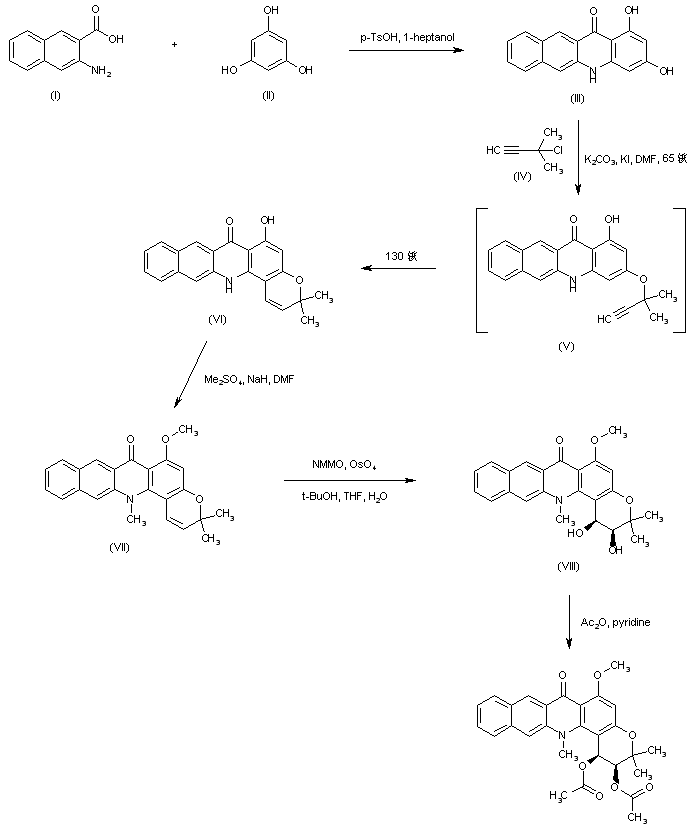 The benzoacridine system (III) was obtained by condensation 3-amino-2-naphthalenecarboxylic acid (I) with phloroglucinol (III) in the presence of p-toluenesulfonic acid in refluxing 1-heptanol. Regioselective O-alkylation of (III) with 3-chloro-3-methylbut-1-yne (IV) in DMF at 65 C gave the intermediate propargyl ether (V), which upon further heating at 130 C underwent Claisen rearrangement to produce the pentacyclic compound (VI). Methylation of (VI) with an excess of dimethyl sulfate in the presence of NaH yielded the O,N-dimethyl derivative (VII). The racemic cis diol (VIII) was obtained by OsO4-catalyzed oxidation of (VII) using N-methylmorpholine-N-oxide. Finally, diol (VIII) esterification with Ac2O in pyridine afforded the title diacetate ester.