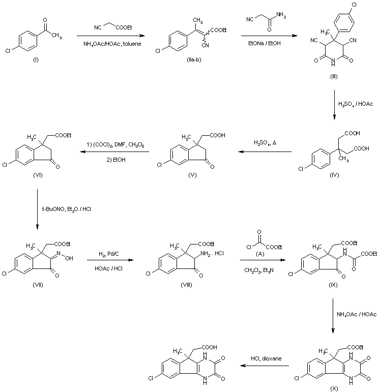 Knoevenagel condensation of ketone (I) with ethyl cyanoacetate followed by Michael addition of cyanoacetamide to the resulting alpha-cyanocinnamate (IIa-b) yields cyclic imide (III). Hydrolysis and decarboxylation of (III) with H2SO4 gives diacid (IV), which is cyclized by means of hot H2SO4 to provide indanone (V). Treatment of (V) with oxalyl chloride in CH2Cl2 and catalytic DMF followed by addition of EtOH affords ethyl ester (VI), which is then converted into oxime (VII) by means of t-BuONO in Et2O and HCl. Hydrogenolysis of (VII) with H2 over Pd/C in HOAc/HCl provides alpha-amino derivative (VIII). By reacting (VIII) with ethyl oxalyl chloride (A), in CH2Cl2 in presence of Et3N, (IX) was obtained and then cyclized in presence of NH4OAc in refluxing HOAc to yield pyrazino derivative (X). Finally (X) is hydrolyzed with HCl in dioxane.