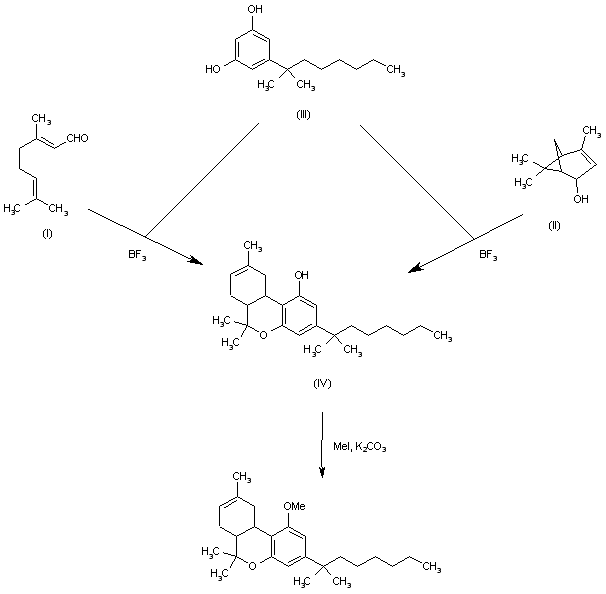 The cyclization of aldehyde (I) or verbenol (II) with resorcinol (III) by means of BF3 in dichloromethane gives the tetrahydrocannabiol analoge (IV) after column chromatography purification. Finally, this product is methylated by means of methyl iodide and K2CO3 in refluxing DMF.