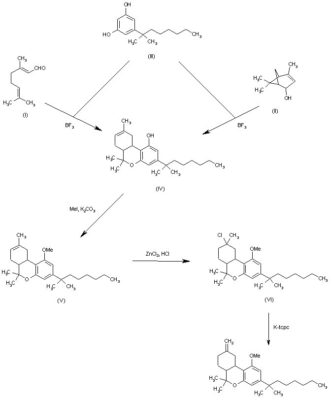 The cyclization of aldehyde (I) or verbenol (II) with resorcinol (III) by means of BF3 in dichloromethane gives the tetrahydrocannabiol analoge (IV) after column chromatography purification. The methylation of (IV) by means of methyl iodide and K2CO3 in refluxing DMF yields the methyl ether (V), which is treated with anhydrous ZnCl2 and HCl in chloroform affording the HCl adduct (VI). Finally, this compound is dehydrochlorinated to the target compound by means of potassium tricyclopentylcarbinolate (K-tcpc) in refluxing toluene.