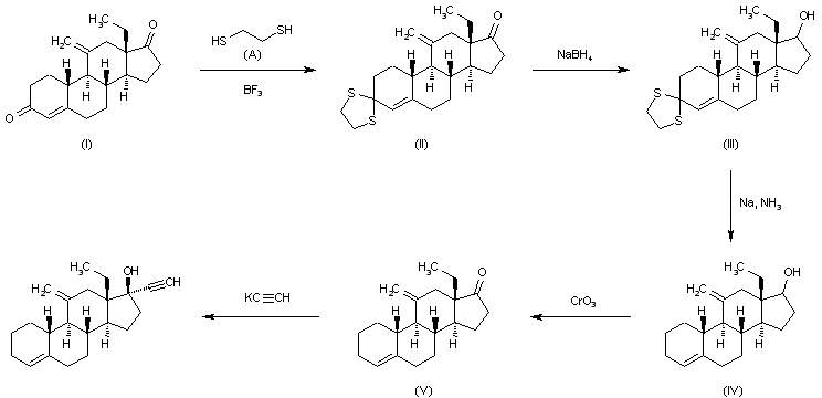 The ketalization of 11-methylene-18-methyl-delta4-oestrene-3,17-dione (I) with ethanedithiol (A) and BF3 etherate in methanol gives the 3,3-ethylenediothioketal (II), which is reduced to hydryl derivative (III) with NaBH4 in ethanol. This compound is reduced with Na in liquid ammonia yielding 11-methylene-18-methyl-delta4-oestrene-17-ol (IV), which is then oxydized with CrO3 in acetone affording 11-methylene-18-methyl-delta4-oestren-17-one (V). Finally (V) is treated with potassium acetylyde in THF.