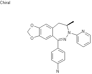 The chiral intermediate (S)-alpha-methyl-1,3-benzodioxole-5-ethanol (IV) was prepared by microbiological reduction of 3,4-methylenedioxyphenyl acetone (I) or, alternatively, by lithiation of 4-bromo-1,2-(methylenedioxy)benzene (II) with sec-butyllithium, followed by addition to (S)-propylene oxide (III). Hydrochloric acid-promoted condensation of (IV) with p-nitrobenzaldehyde (V) in hot toluene gave rise to the dioxolobenzopyran system (VIa-b), which was hydroxylated to (VIIa-b) by air oxidation under alkaline conditions. Hydrazone (IXa-b) was obtained as a mixture of E,Z isomers upon treatment of (VIIa-b) with 2-hydrazinopyridine (VIII) in refluxing EtOH. After mesylation of the alcohol group of (IXa-b) with methanesulfonyl chloride and triethylamine, the resulting mesylate (Xa-b) was cyclized to the dioxolo benzodiazepine (XI) using lithium tert-butoxide in THF. The nitro group of (XI) was finally reduced to the target aniline by transfer hydrogenation with potassium formate in the presence of Pd/C.
