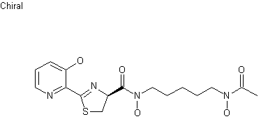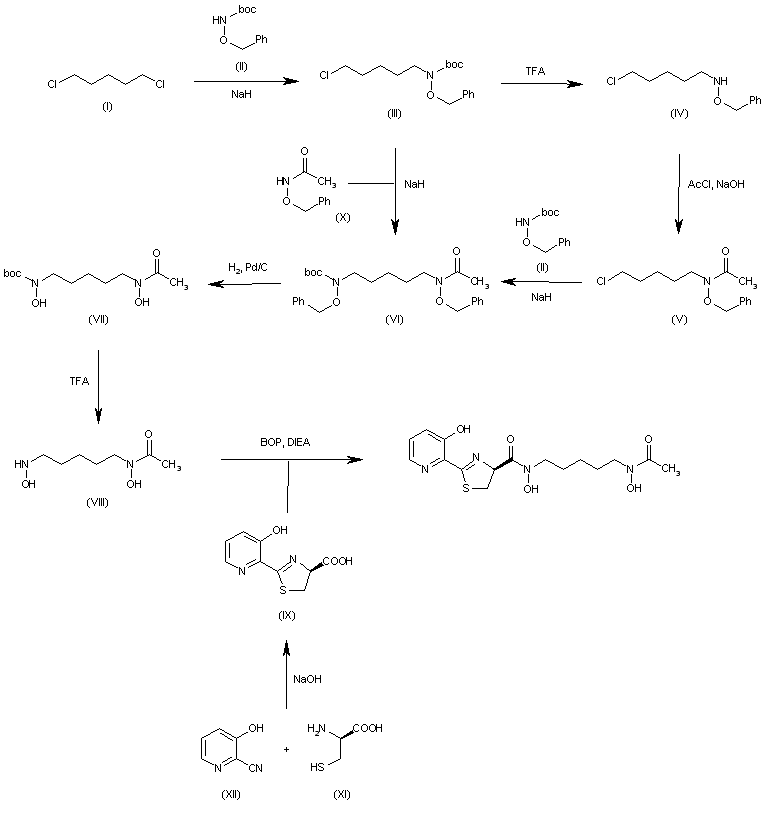 The reaction of 1,5-dichloropentane (I) with N-(benzyloxy)carbamic tert-butyl ester (II) by means of NaH in DMF gives N-(benzyloxy)-N-(5-chloropentyl)carbamic acid tert-butyl ester (III), which is treated with TFA in dichloromethane to yield the O-(benzyloxy)hydroxylamine (IV). The acylation of (IV) with AcCl and NaOH in dichloromethane affords the acetamide (V), which is condensed with (II) by means of NaH in DMF giving the acetamidopentyl carbamate (VI), which is debenzylated with H2 over Pd/C in methanol providing the dihydroxy compound (VII). The treatment of (VII) with TFA in dichloromethane gives the free hydroxylamine derivative (VIII), which is finally condensed with the thiazolinecarboxylic acid (IX) by means of BOP and DIEA in DMF to furnish the target compound. Alternatively the condensation of intermediate N-(benzyloxy)-N-(5-chloropentyl) carbamic acid tert-butyl ester (III) with N-(benzyloxy)acetamide (XI) by means of NaH in DMF gives directly the previously described acetamidopentyl carbamate (VI). The intermediate the thiazolinecarboxylic acid (IX) has been obtained by cyclization of D-cysteine (XI) with 3-hydroxypyridine-2-carbonitrile (XII) by means of NaOH in water.
