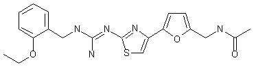 The cyclization of N-[5-(2-chloroacetyl)furan-2-ylmethylacetamide (I) with thiourea (II) in ethanol gives the thiazole (III), which is condensed with benzoyl isothiocyanate (IV) in acetone to yield the benzoylthiourea (V). The hydrolysis of (V) with NaOH in aqueous methanol affords the thiourea (VI), which is treated with methyl iodide in methanol to give the S-methylisothiourea (VII). Finally, this compound is condensed with 2-ethoxybenzylamine (VIII) in EtOH/AcOH.